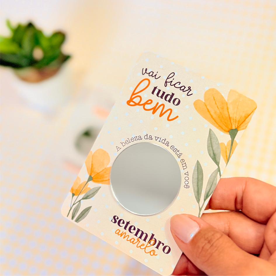 O card vai com um espelhinho fixado no centro